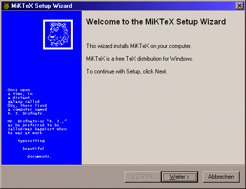 1. Die Installation wird per Doppelklick auf die Datei setup.exe (welche man hier bekommt) gestartet (Sollte eine Meldung erscheinen, dass eine Windows-Komponente fehlt oder zu alt ist (unter Win9x und NT4 möglich) müssen zunächst 4 dll-Dateien erneuert werden. Dies geht am einfachsten mittels des hier verfügbaren kleinen Programms.) und das folgende Fenster erscheint: