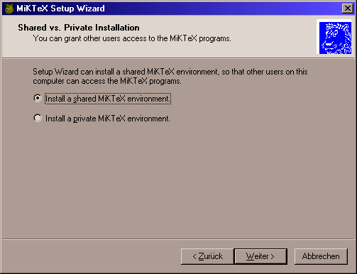12. "Weiter >" anklicken und im folgenden Fenster "Install a shared MiKTeX environment" (ermöglicht allen Nutzern des Computers auf MiKTeX zuzugreifen) markieren: