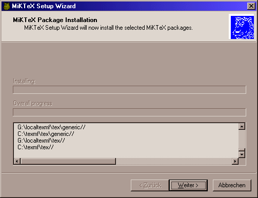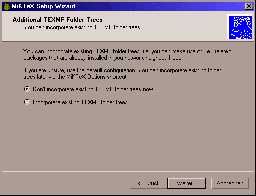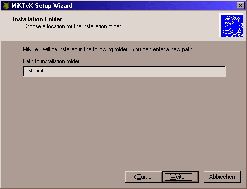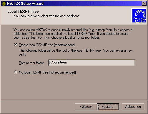 Bevor die Installation gestartet wird, sollte ein Ordner localtexmf angelegt werden (z. B. C:\localtexmf). In diesem Verzeichnisbaum legt man später zusätzliche LaTeX-Pakte, Fonts usw. ab. Bei einem Update von MiKTeX bleiben alle darin enthaltenen "privaten" Einstellungen erhalten.