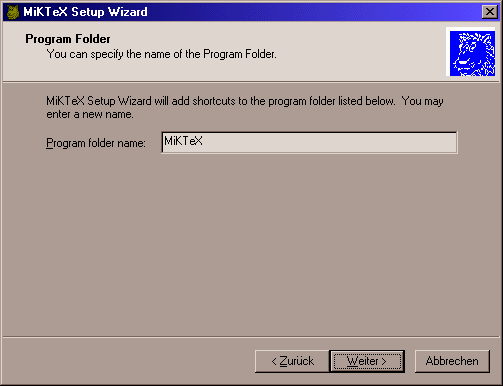 14. Ich empfehle die Installation in das Verzeichnis C:\texmf, wobei ich damit die Installation auf der Hauptebene empfehle, das Laufwerk ist egal. "Weiter >" anklicken und der Ordner für das Startmenü kann eingegeben werden: