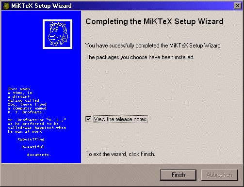 20. Nach Abschluss der Installation noch auf "Finish" klicken und MiKTeX ist vollständig installiert.