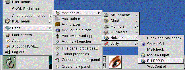 Eine andere Methode für das Starten der Anwendung und deren Einfügen in das Panel besteht darin, mit der rechten Maustaste auf das Panel zu klicken und dann Applet hinzufügen => Netzwerk => RH PPP Dialer zu wählen.