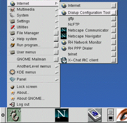 Wenn Sie RP3 starten möchten, ohne das Programm in das Panel einzufügen, können Sie einfach im GNOME Hauptmenü (unter Netzwerk => RH PPP Dialer) den entsprechenden Eintrag für das Programm auswählen oder in einem XTerm-Fenster /usr/bin/rp3 eingeben.