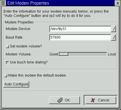 Sie können durch Klicken auf den Button Auto Configure auch erneut nach Modems in Ihrem System suchen lassen und dann die gefundenen Einstellungen übernehmen.
