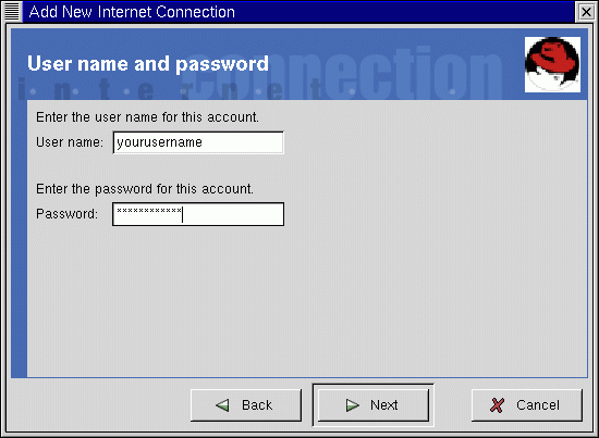 Im nun folgenden Dialogfeld mit der Bezeichnung User name and password müssen Sie Ihren Benutzernamen und Ihr Passwort für die Anmeldung bei Ihrem ISP angeben. Ihr Passwort wird in Form einer Reihe von Sternchen auf dem Bildschirm angezeigt (siehe Abbildung 6-7).