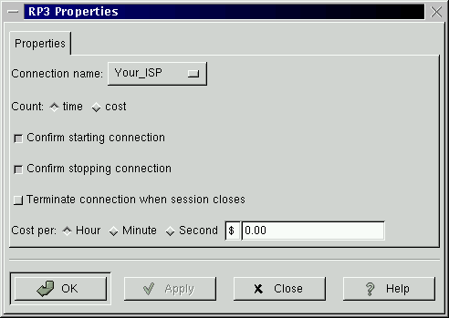Cost per: Wenn die Kosten für Ihren Internet-Zugang nach Stunden, Minuten oder Sekunden abgerechnet werden, können Sie hier den gültigen Tarif eingeben. Wenn die Verbindung besteht, werden die aktuellen Verbindungskosten im RP3-Monitor angezeigt.