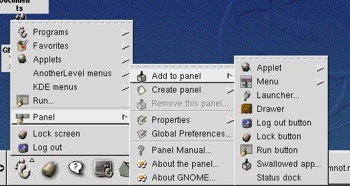 Um den Button in Ihr Panel einzufügen, öffnen Sie das Hauptmenü und wählen dort die Optionen Panel => Add to panel und schließlich Log out button (siehe Abbildung 4-2). Danach müssen Sie zum Abmelden lediglich auf diesen Button im Panel klicken.