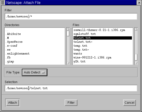 Auf gleiche Weise wie Webseiten können Sie auch andere Dateien auf Ihrem Computer in Ihre Nachrichten einfügen. Klicken Sie auf den Button Attach in der Symbolleiste oder unter dem Adressfeld, und wählen Sie im Menü den Befehl File. Daraufhin wird das Dialogfeld Attach File geöffnet, in dem der Inhalt Ihres Anmeldeverzeichnisses dargestellt wird (siehe Abbildung 7-16).