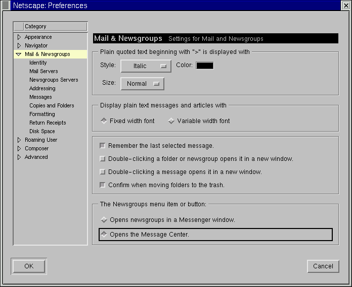 Um Nachrichten lesen und senden zu können, müssen Sie Ihre persönlichen Einstellungen in der Kategorie Mail & Newsgroups von Communicator (Edit=>Preferences) eingeben. Außerdem können Sie in dieser Kategorie noch alle weiteren Einstellungen für E-Mails und Newsgroups festlegen.