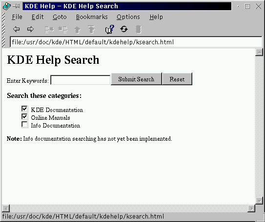 Eine nützliche Erweiterung des Hilfe-Browsers ist die Fähigkeit, die auf Ihrem System installierte Dokumentation und die darin enthaltenen Hilfetexte zu durchsuchen. Hierfür stehen Ihnen neben der eigentlichen Dokumentation zu KDE auch man-Seiten zur Verfügung (künftig wird es auch möglich sein, Info-Seiten zu durchsuchen, momentan steht diese Funktion aber noch nicht zur Verfügung).