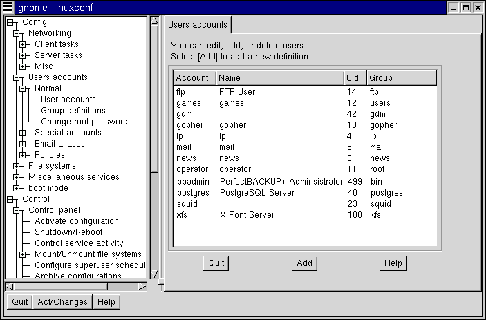One of the most powerful tools you can use for system administration is Linuxconf. You can use Linuxconf for adding and manipulating accounts, monitoring system activities, controlling the way your system starts, and more.