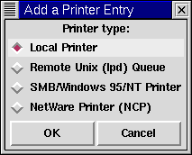SMB/Windows 95/NT Printer: A printer which is attached to a machine running Windows or Samba. (Samba is a suite of programs which allows Windows machines to share files and services with UNIX and Linux machines on a network.)