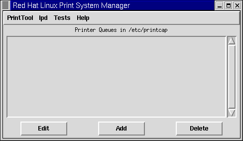 When the utility starts, you'll see a window similar to Figure 5-2. At first, you won't find any printers listed, because you haven't added a printer to /etc/printcap.