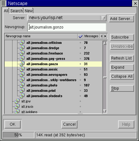 Your next task is to download the list of newsgroups from your ISP's news server, and to subscribe to those groups in which you have an interest. Be prepared: Depending on the speed of your connection, downloading the list of many thousands of newsgroups can take some time. While you wait for the complete list, you may have enough time to make a pot of coffee, phone a friend -- or read a novel (just kidding).