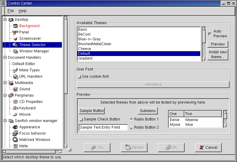 ¿No está seguro de que le guste la opción elegida? Haga click en la tecla Try para ver como aparecerá su escritorio después de los cambios realizados. Si no le gusta, basta con que haga click en la tecla Revert para cancelar las modificaciones realizadas. |