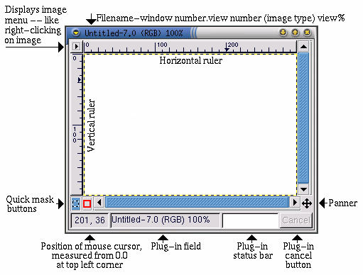 Lorsque vous chargez une image ou ouvrez une nouvelle image, GIMP entoure l'image d'un cadre comprenant des informations et outils utiles, comme illustré à la Figure 9-8.