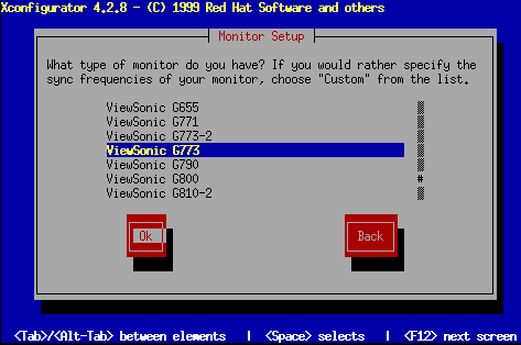 Pour continuer, appuyez sur la touche de tabulation jusqu'à ce que le bouton Ok soit en surbrillance, puis appuyez sur Entrée. Xconfigurator teste alors votre système afin de détecter votre carte vidéo, et suggère le serveur X correspondant à votre système, comme à la Figure 17-4. Cliquez sur le bouton Ok pour poursuivre.