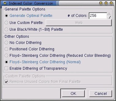 Prima che GIMP vi permetta di salvare un'immagine come .gif, avrete bisogno di convertirla in colori indicizzati o in scala di grigi. Potete convertire l'immagine in colori indicizzati cliccando con il tasto destro del mouse sull'immagine e selezionare Image => Mode => Indexed. Verrà visualizzata la finestra di dialogo Indexed Color Conversion: