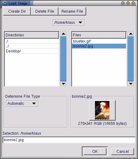 La funzione che completa il nome del file è supportata da GIMP. Se digitate la prima lettera di un nome di un file nel campo Selection e premete il tasto Tab, verranno visualizzate solo le sottodirectory e/o i file che iniziano con quella lettera.