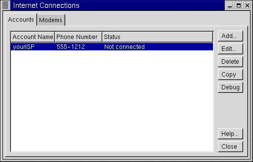 Nella finestra di dialogo Internet Connections, potete aggiungere un nuovo account, cancellarne uno e modificare la configurazione di un account corrente. Potete anche effettuare il debug dell'account, che significa che potete verificare la vostra configurazione per vedere se ci sono problemi.