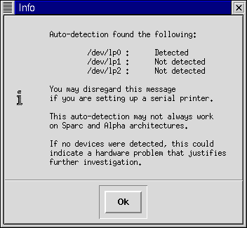 Nel vostro esempio, una porta parallela della stampante è stata vista come /dev/lp0. Cliccate sul tasto OK per continuare.