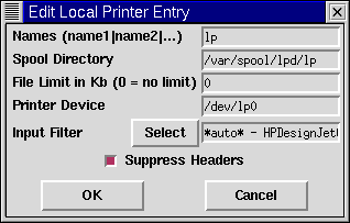 Nel campo Names, potete specificare un nome per la vostra coda di stampa (dove vengono inviati i lavori di stampa), e la directory di default alla quale volete che vengano mandate le vostre stampe (entry dello Spool Directory). Probabilmente potete lasciare inalterate queste configurazioni; notate che chiamando lp la rende una default printer.