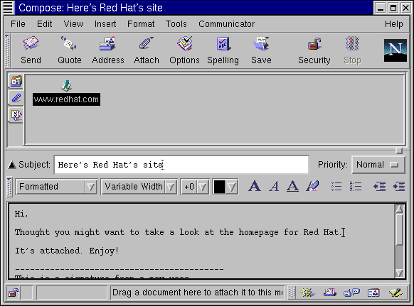 Potete trascinare file dal vostro desktop o dal file manager allo stesso modo con cui trascinate le URL da Navigator. Dovete solo premere il tasto del mouse sul file che volete allegare, e trascinarlo sul campo attachment del vostro messaggio. |