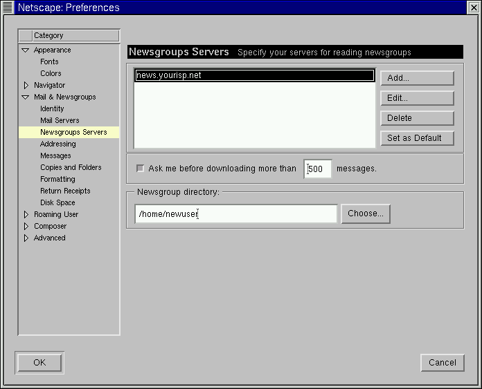 Potete specificare dove la vostra posta deve venire conservata inserendo la posizione in Local mail directory, oppure premendo il tasto Choose, e selezionando una directory nella finestra del browser. Di default la posta verrà inviata in una directory all'interno della home dell'utente; se il vostro nome è newuser, per esempio, il percorso della directory è /home/newuser/nsmail.