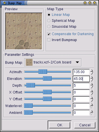Per applicare il filtro, fate un click con il tasto destro del mouse quindi selezionate Filters => Map =>Bump map per visualizzare la finestra di dialogo Bump Map: