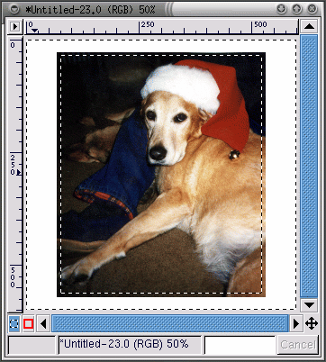 Create una nuova immagine grande quanto la fotografia di Bac con uno sfondo bianco. Lavorate sull'immagine di Bac nella sua larghezza. Utilizzate il tool per la selezione rettangolare per selzionare un rettangolo più piccolo dell'immagine di Bac. Cliccate con il tasto destro sull'immagine e scegliete Select => Invert per invertire la selezione, in modo tale da selezionare una cornice rettangolare intorno all'immagine come nella Figura 9-13.