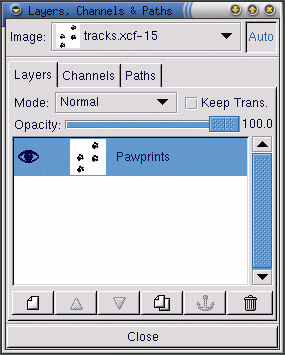La finestra di dialogo Layers mostra tutti i layer dell'immagine. Come mostrato nella Figura 9-17, l'immagine include solo un layer, che viene chiamato Pawprints (click con il tasto destro del mouse sul layer quindi selezionate Edit layer attributes e scegliete un nome descrittivo).