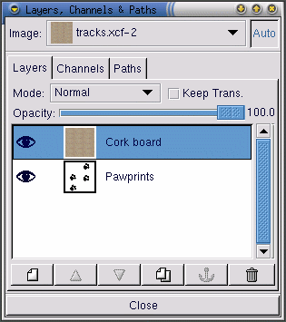 Successivamente il criterio Cork board vine aggiunto al nuovo layer dell'immagine. Utilizzate Layers => Layers, Channels & Paths per visualizzare la finestra di dialogo Layers, Channels & Paths come mostrato in figura Figura 9-17.