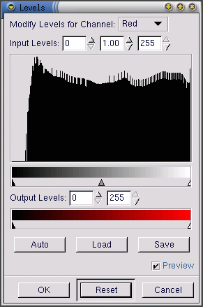 GIMP può essere utilizzato per modificare un po' i colori. Cliccate con il tasto destro sull'immagine e selzionate Image => Colors => per visualizzare la finestra di dialogo Levels. Dato che siamo interessati al miglioramento del colore selezioniamo, Red dal menu a tendina Modify Levels for Channel come nella Figura 9-10.