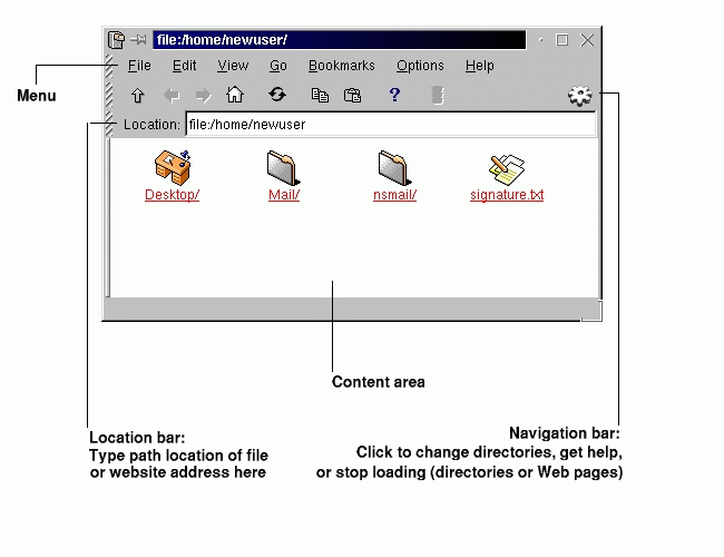 Se avete già usato un file manager o un browser, vi sentirete a vostro agio utilizzando KFM. Potete digitare il path (percorso) della posizione di un file (o l'indirizzo di un sito FTP) nella barra Location. Sopra la barra Location, le icone della Navigation bar vi aiuteranno a spostarvi in altre directory. Segue una breve descrizione delle icone: