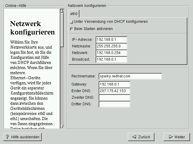 Wählen Sie Ihren Gerätetyp aus, und legen Sie fest, ob Sie die Konfiguration unter Verwendung von DHCP (Dynamic Host Configuration Protocol) vornehmen möchten. Wenn Sie über mehrere Ethernet-Geräte verfügen, werden in allen Gerätebildschirmen die von Ihnen eingegebenen Daten gespeichert. Sie können auch zwischen den verschiedenen Gerätebildschirmen (wie beispielsweise eth0 und eth1) umschalten. Die von Ihnen eingegebenen Daten beziehen sich immer nur auf den jeweils ausgewählten Bildschirm für ein bestimmtes Gerät. Wenn Sie die Option Beim Starten aktivieren auswählen, wird Ihre Netzwerkschnittstelle beim Booten gestartet. Falls Sie keinen Zugriff auf einen DHCP-Server haben oder Fragen zur Konfiguration haben, wenden Sie sich an Ihren Netzwerkadministrator.