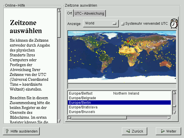 Sie können die Zeitzone entweder durch Angabe des physischen Standorts Ihres Computers oder Festlegen der Abweichung Ihrer Zeitzone von der UTC (Universal Coordinated Time = koordinierte Weltzeit) einstellen.