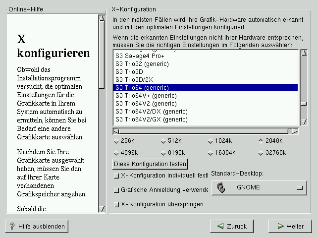 Wenn Sie die Pakete für das X Window System installieren möchten, haben Sie jetzt die Gelegenheit, einen X-Server für das System zu konfigurieren. Wenn Sie die Pakete für das X Windows System nicht installieren wollen, fahren Sie mit Abschnitt namens Installieren der Pakete fort.