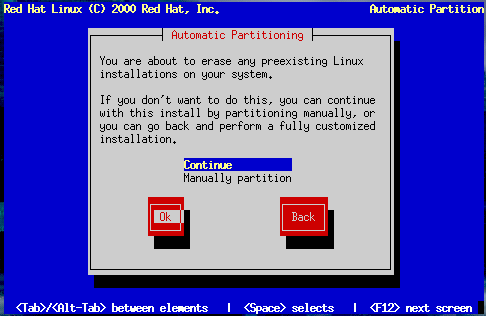 If the Automatic Partitioning screen does not appear, you may not have enough free disk space for this installation. You can either reboot your system and try to allocate more disk space, or you can choose to partition manually. |