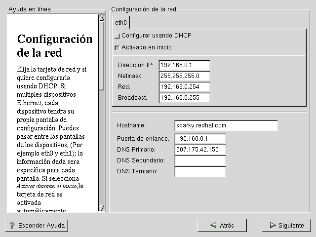 Elija el tipo de dispositivo y si quiere configurarlo utilizando el protocolo DHCP (Dynamic Host Configuration Protocol). Si tiene múltiples dispositivos Ethernet, cada dispositivo conservará la infomación que le haya suministrado. Podrá conmutar de un dispositivo a otro, por ejemplo eth0 y eth1, y las informaciones que proporcione serán específicas para cada dispositivo. Si selecciona Activar al arrancar, su interfaz de red será iniciado cuando arranque. Si no tiene acceso DHCP como cliente o no está seguro de la propia configuración, contacte con su administrador de red.