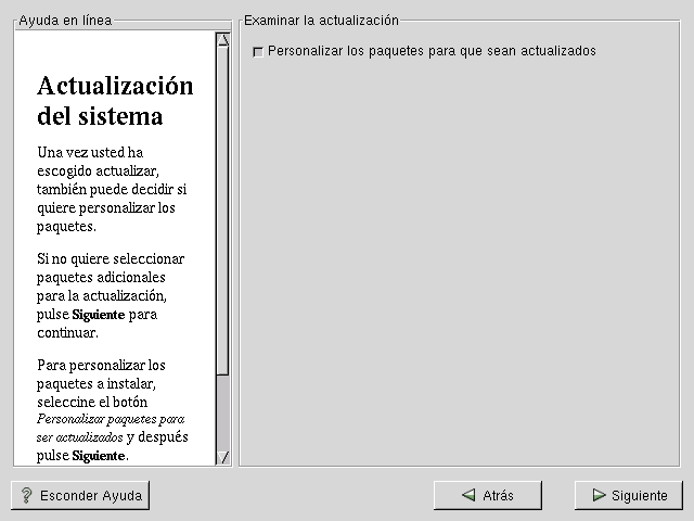 Para permitir al programa de instalación empezar el proceso para usted, asegúrese de que Customize packages to upgrade no ha sido seleccionado y haga click sobre Next (véase la sección de nombre Actualización de los paquetes).