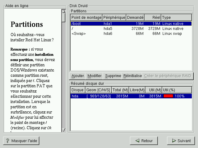 Si vous n'avez pas encore défini la configuration des partitions, reportez-vous à l'annexe du Guide officiel de référence Red Hat Linux consacrée au partitionnement. Vous avez besoin au minimum d'une partition root de 900 Mo et d'une partition de swap de 16 Mo. |