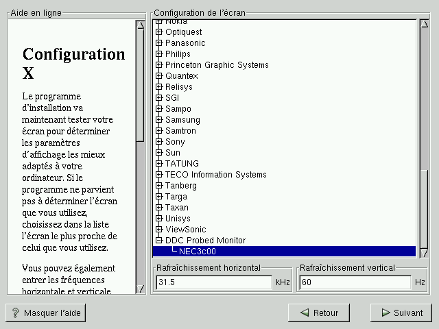 Si l'écran ne figure pas dans la liste, sélectionnez le modèle générique disponible le plus approprié. Si vous sélectionnez un écran générique, Xconfigurator propose des fréquences horizontale et verticale. Ces valeurs sont généralement disponibles dans la documentation fournie avec l'écran et auprès du vendeur ou du fabricant ; reportez-vous à la documentation pour vérifier si ces valeurs sont correctement définies.