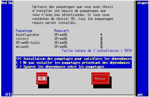 Si un paquetage en requiert un autre que vous avez choisi de ne pas installer, le programme affiche la liste de ces dépendances non résolues et vous offre la possibilité de les résoudre. Si vous appuyez simplement sur OK, le programme les résout automatiquement en ajoutant tous les paquetages requis à la liste des paquetages sélectionnés.