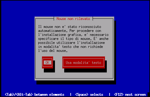 Se vi appare una videata con il messaggio Mouse non rilevato (vedasi Figura 5-1), significa che il programma di installazione non è riuscito a riconoscere il tipo di mouse collegato.