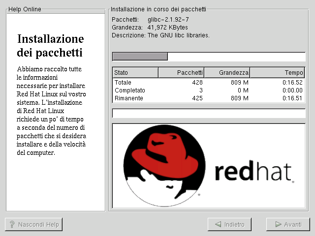 Potrebbe accadere che vi venga chiesto di installare l'altro CD-ROM Red Hat Linux per proseguire l'installazione dei pacchetti. Se avete scelto una installazione di classe workstation e non avete selezionato quali pacchetti da installare, non dovrete inserire il secondo CD-ROM.