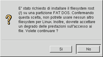 Comparirà una finestra di conferma (vedasi Figura B-3) chiedendovi di confermare se volete continuare con questa installazione. Vi spiegherà anche che non potete avere altre partizioni Linux sul vostro sistema se non la partizione /. Cliccate sul pulsante Yes per continuare.