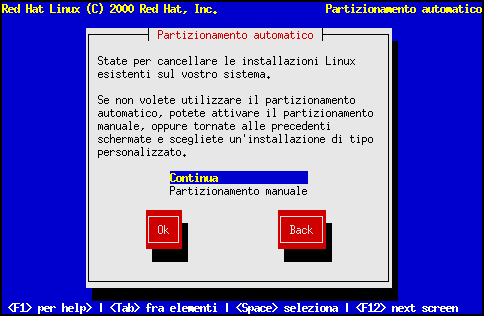 Se non appare la schermata Automatic Partitioning non avete spazio sufficiente per questo tipo di installazione. Potete eseguire un reboot del vostro sistema e provare ad allocare più spazio disco, o scegliere il partizionamento manuale. |