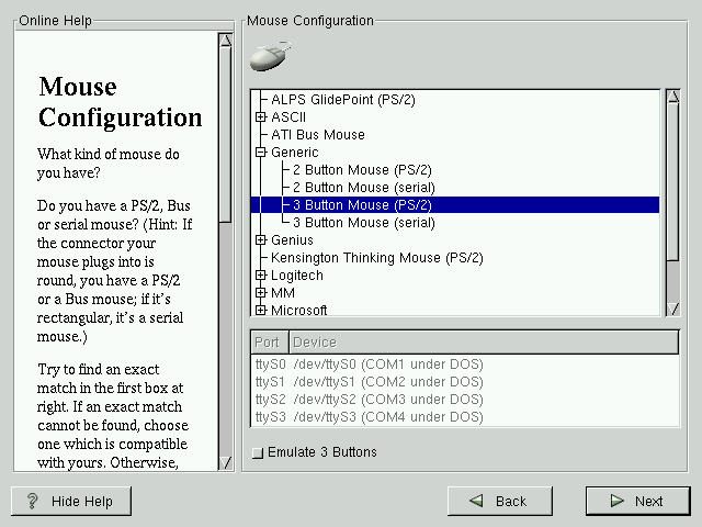Das Kontrollkästchen Drei Tasten emulieren ermöglicht es Ihnen, eine Zwei-Tasten-Maus auf gleiche Weise wie eine Drei-Tasten-Maus zu verwenden. Das X Window System kann im Allgemeinen am einfachsten mit einer Drei-Tasten-Maus bedient werden. Wenn Sie dieses Kontrollkästchen aktivieren, können Sie eine dritte, "mittlere" Maustaste emulieren, indem Sie beide Maustasten gleichzeitig drücken.