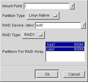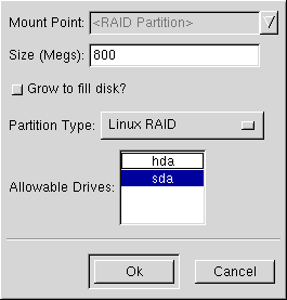If you are making a RAID partition of /boot, you must choose RAID level 1 and it must use one of the first two drives (IDE first, SCSI second). If you are not creating a RAID partition of /boot, and are making a RAID partition of /, it must be RAID level 1 and it must use one of the first two drives (IDE first, SCSI second). |