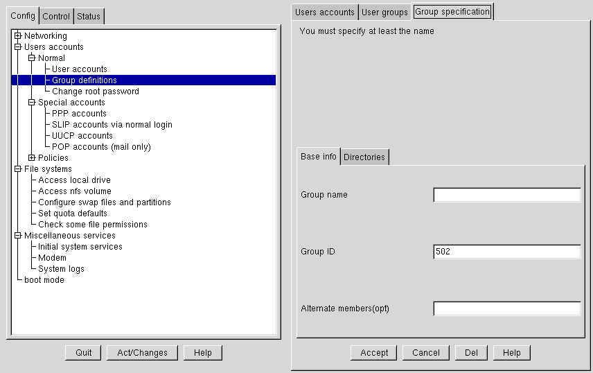 | Create/delete a group | Config => Users accounts => Normal => Group definitions |